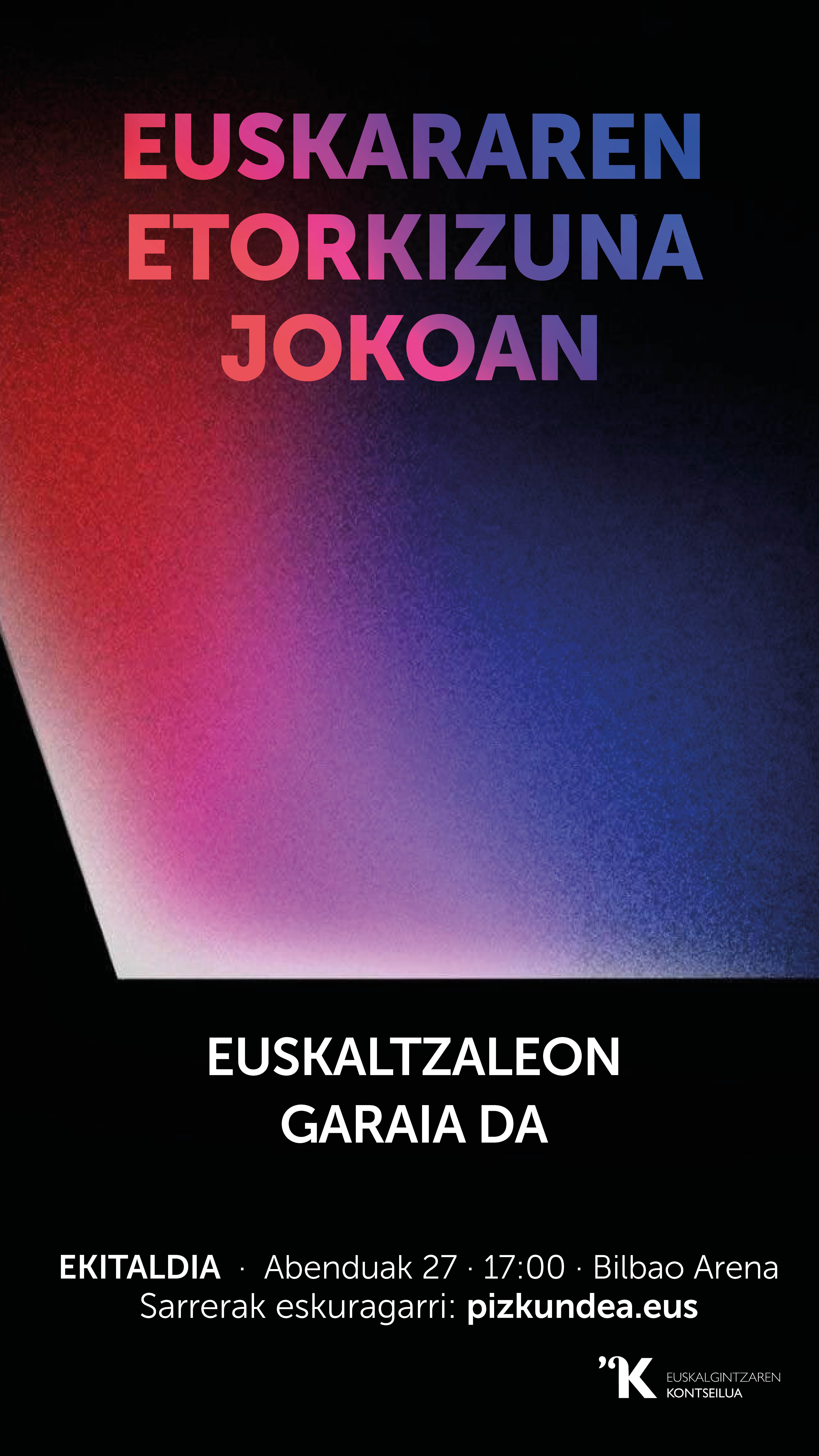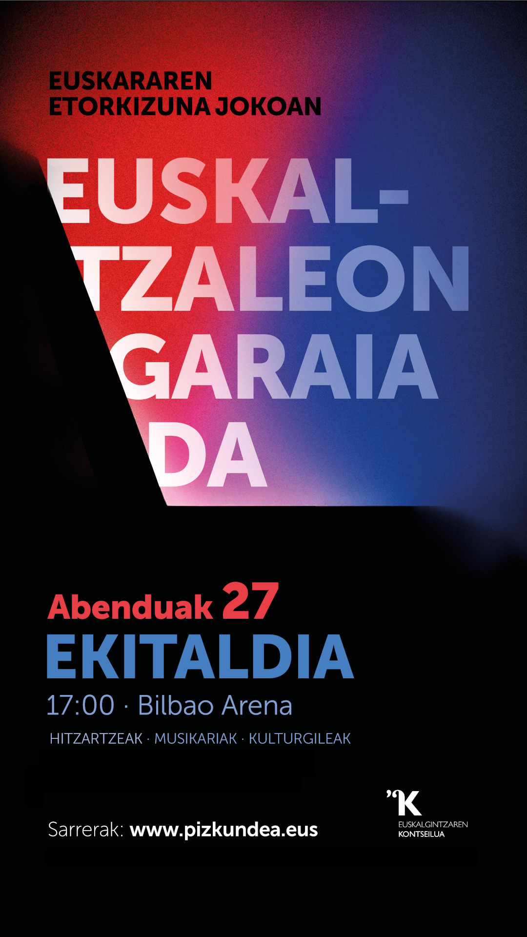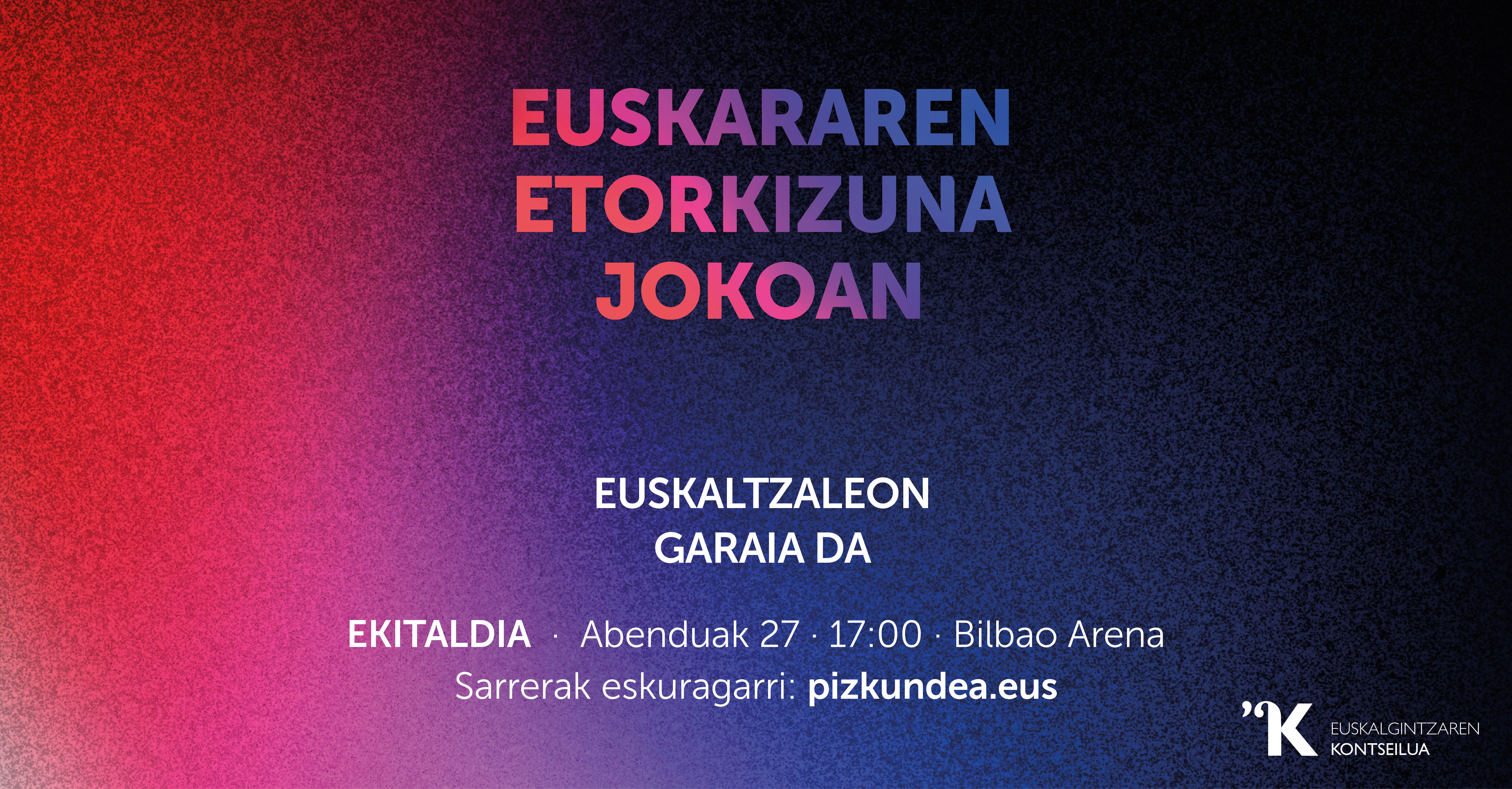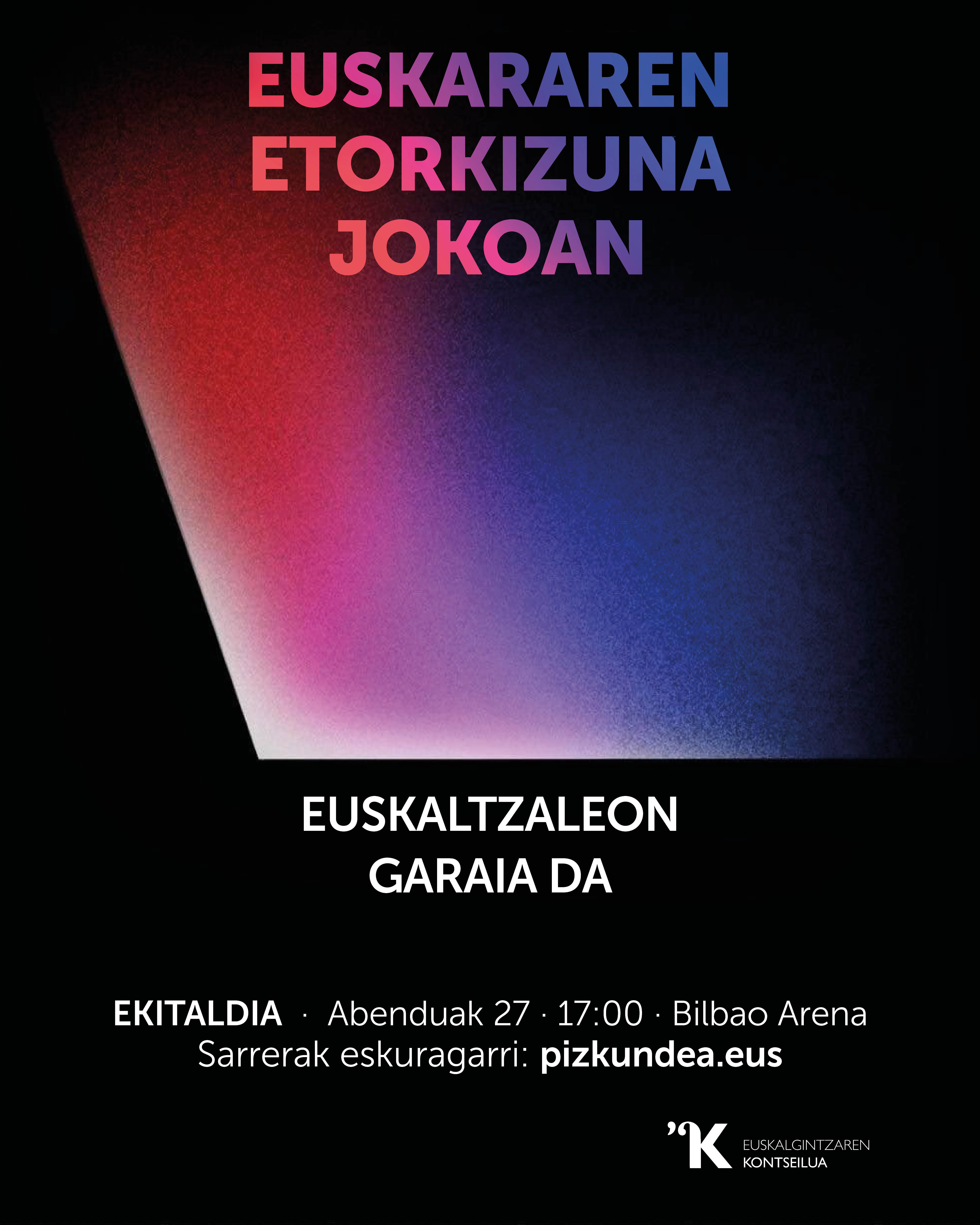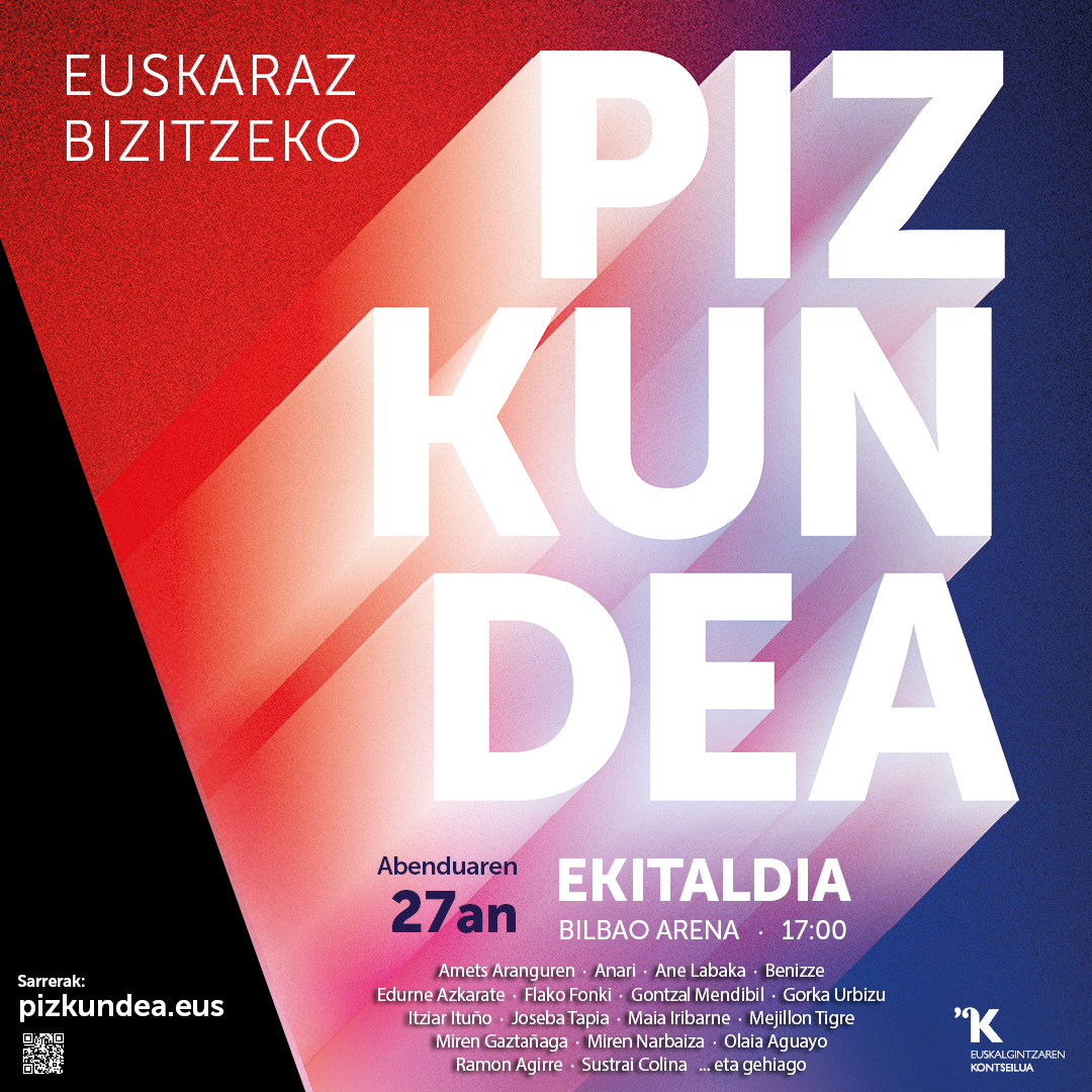 Abenduaren 27an, Euskalgintzaren Kontseiluak eta bazkideek deituta, Bilbao Arena euskaltzalez beteko duen EKITALDIA antolatuko dugu. Informazio guztia eta sarrerak www.pizkundea.eus webgunean daude eskuragarri.