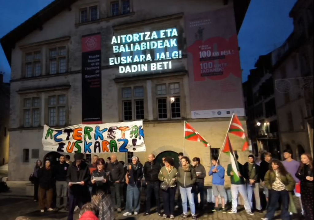 Honen aurrean, Euskalgintzaren Kontseiluak eta Euskal Konfederazioak Baionako Euskal Museoaren fatxada argiztatu dugu, proiektore batekin «Aitortza eta baliabideak, euskara jalgi dadin beti. Euskaltzaleon garaia da» idatzita.